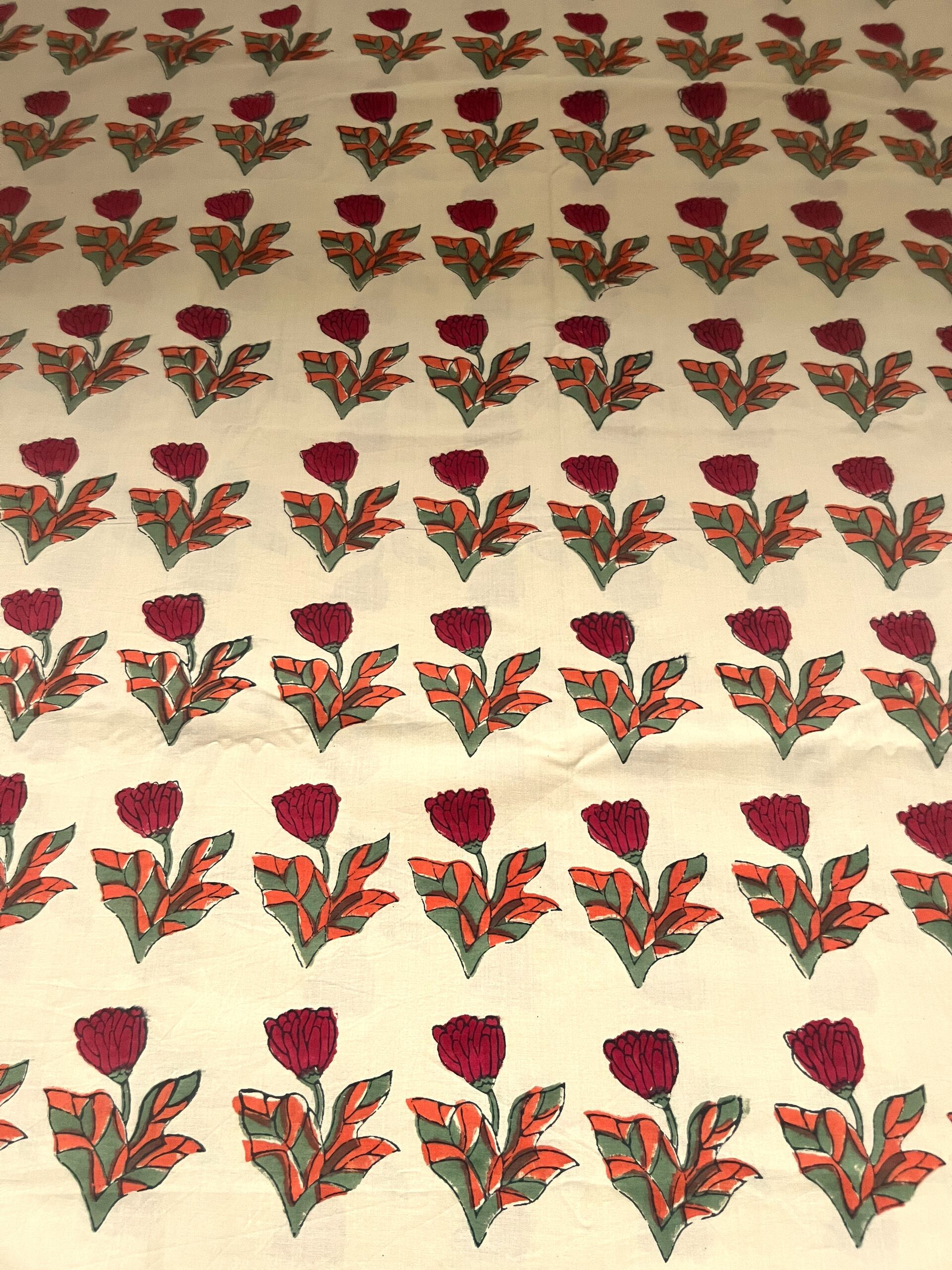 インド職人が木版を押し当て色柄を重ねて作っていくインドの伝統的な技法です。