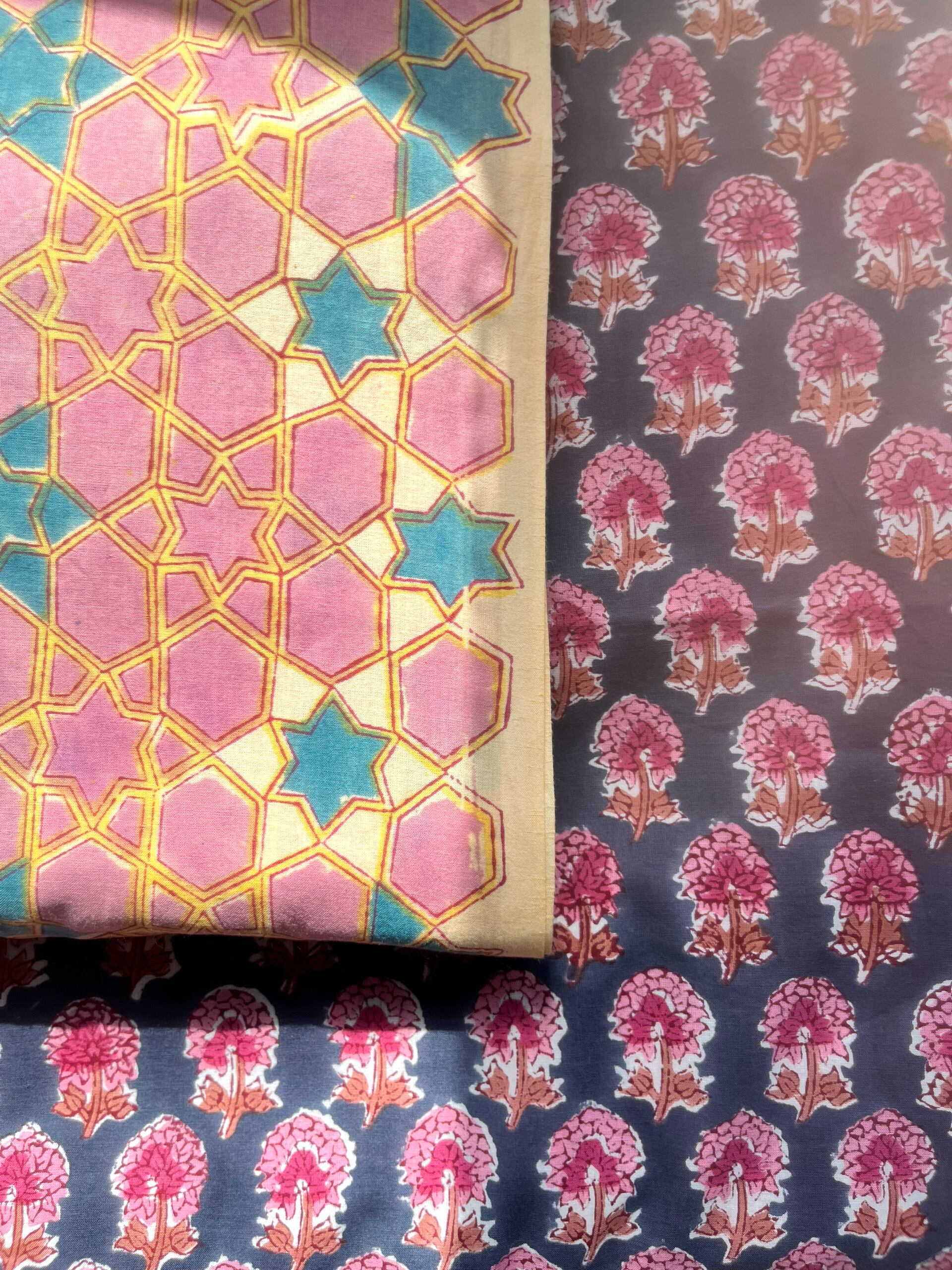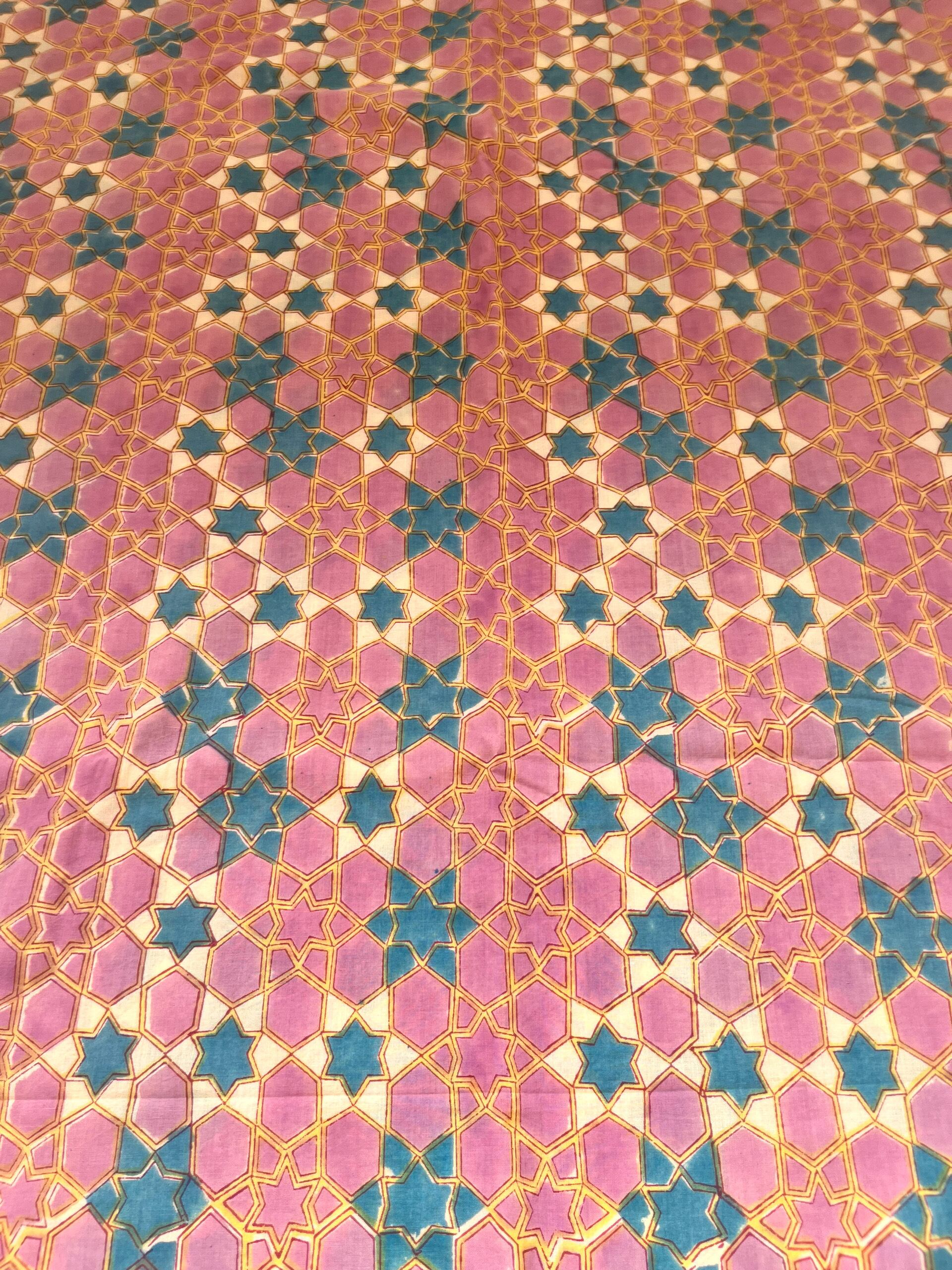 インド職人が木版を押し当て色柄を重ねて作っていくインドの伝統的な技法です。