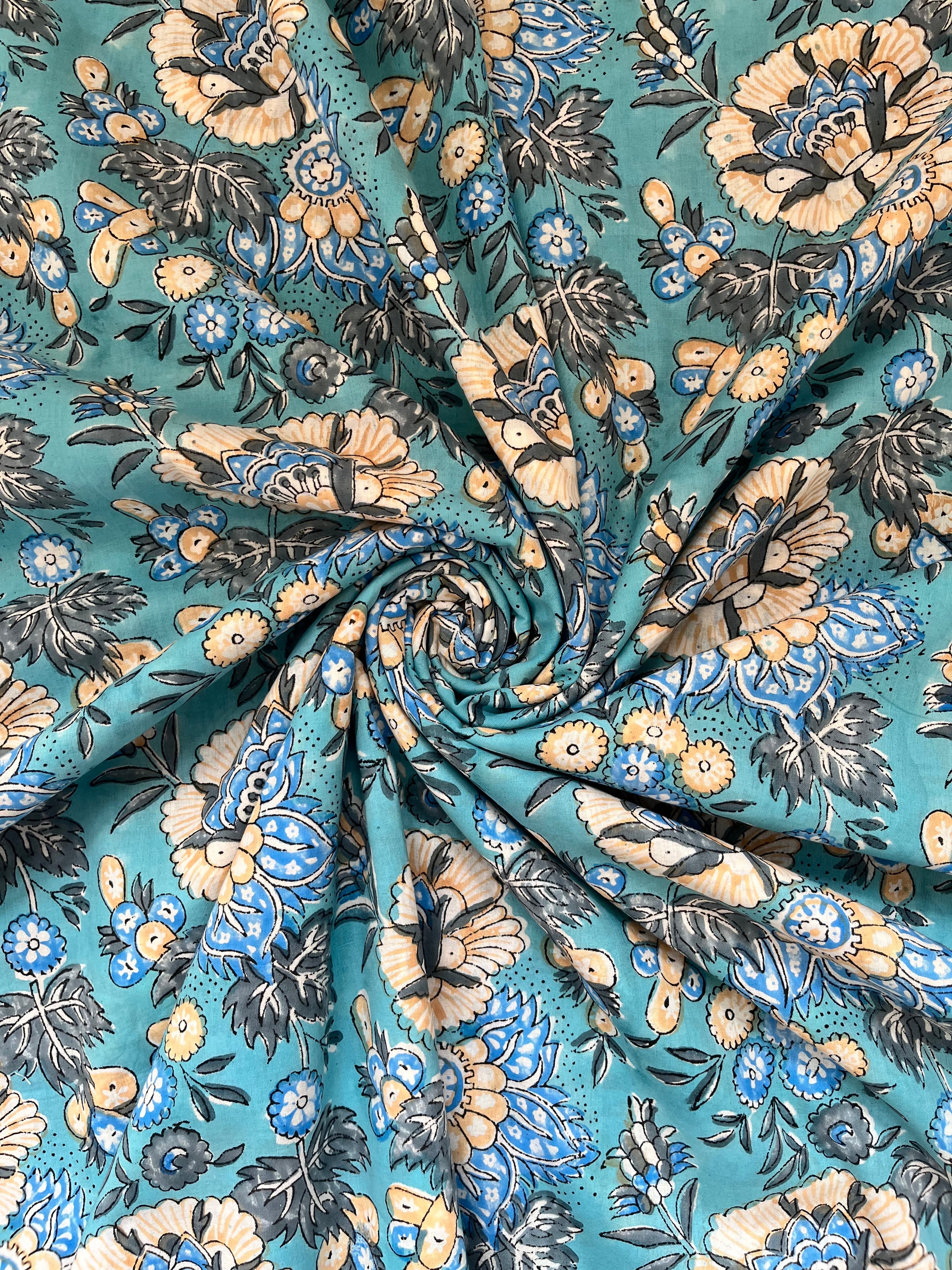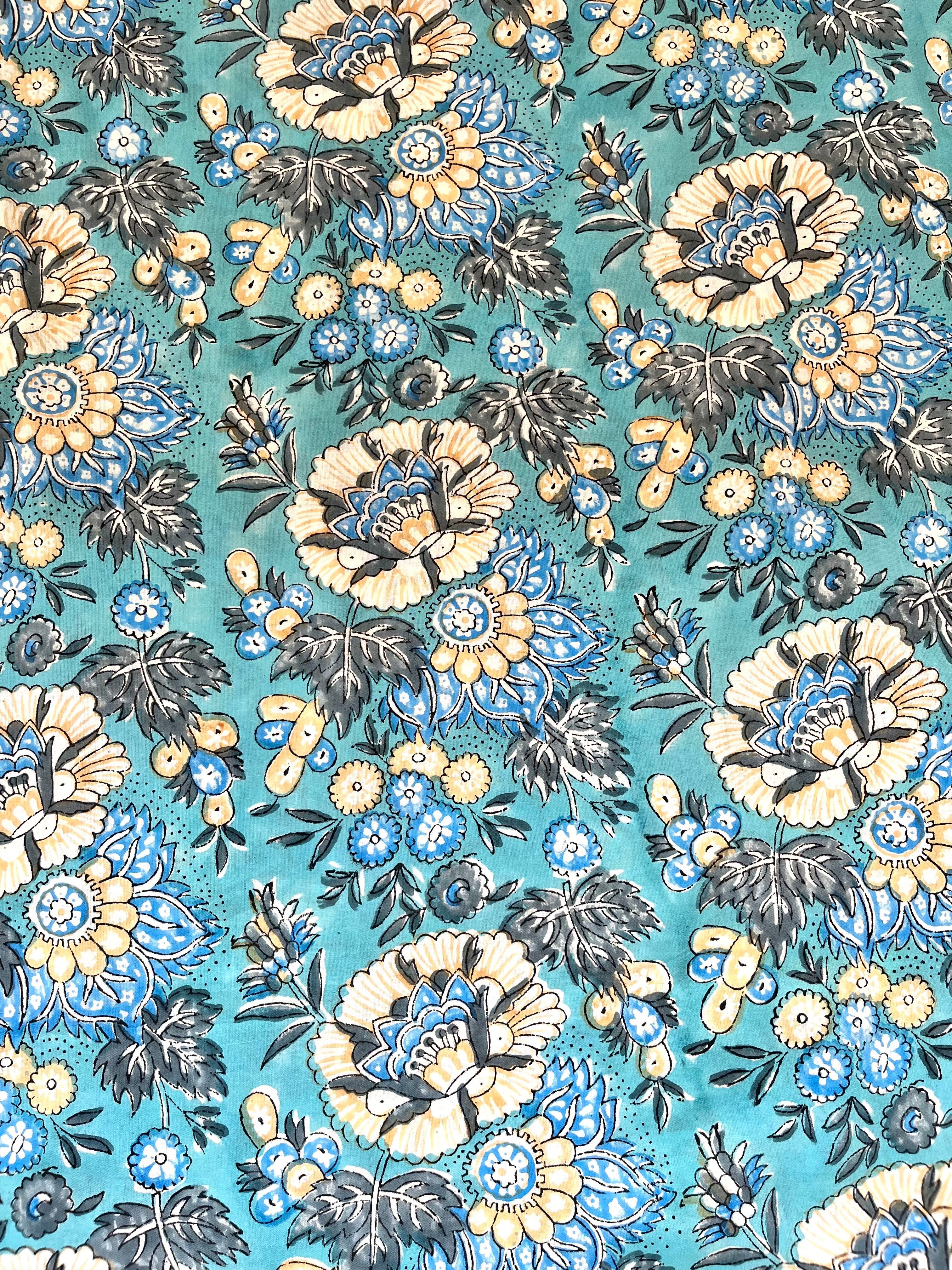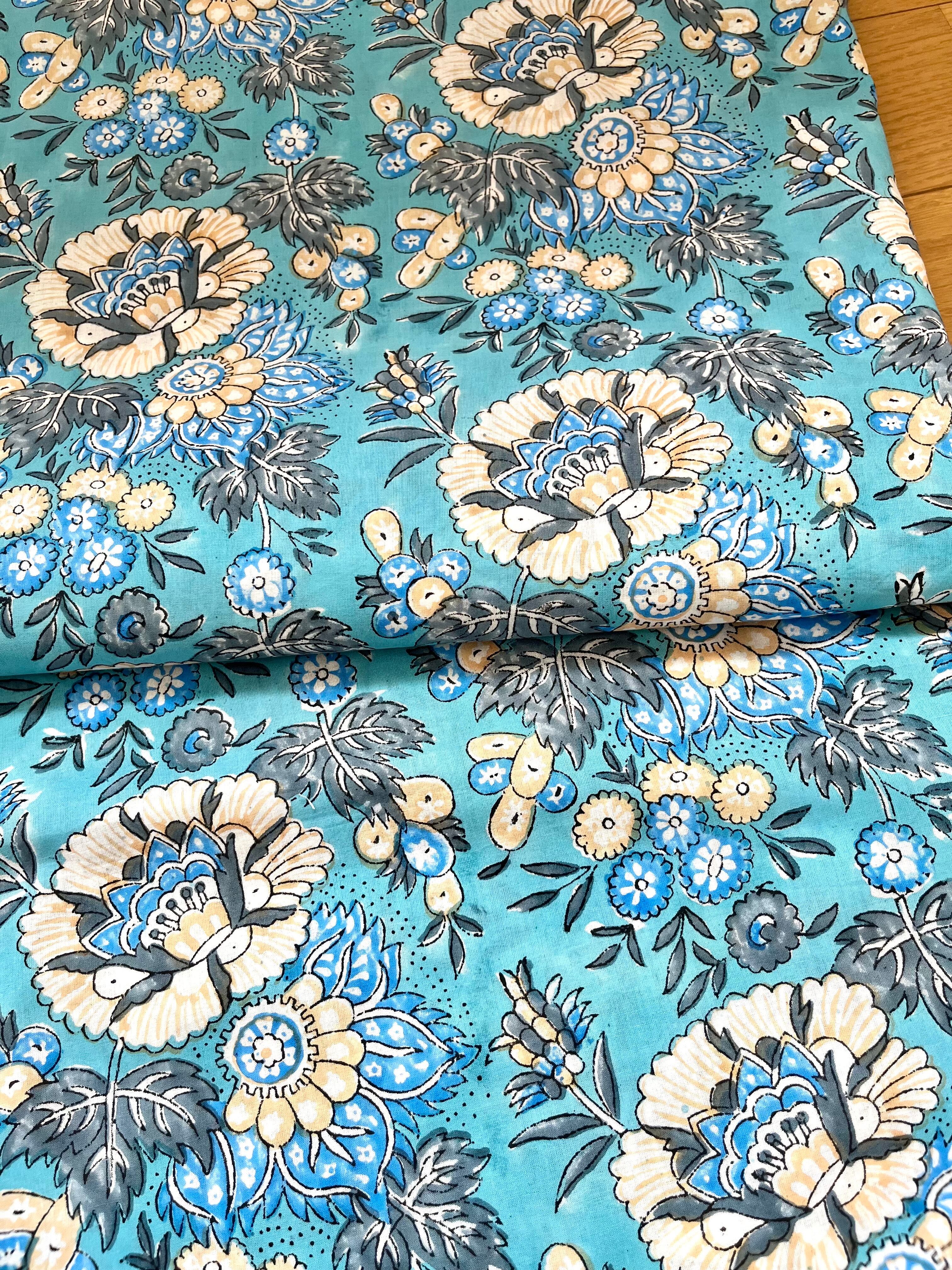 インド職人が木版を押し当て色柄を重ねて作っていくインドの伝統的な技法です。