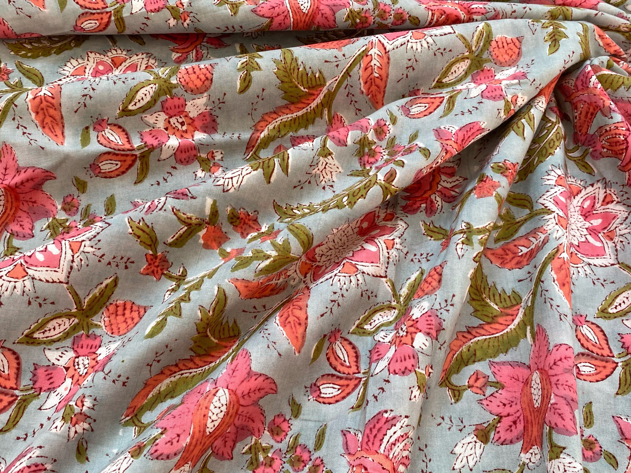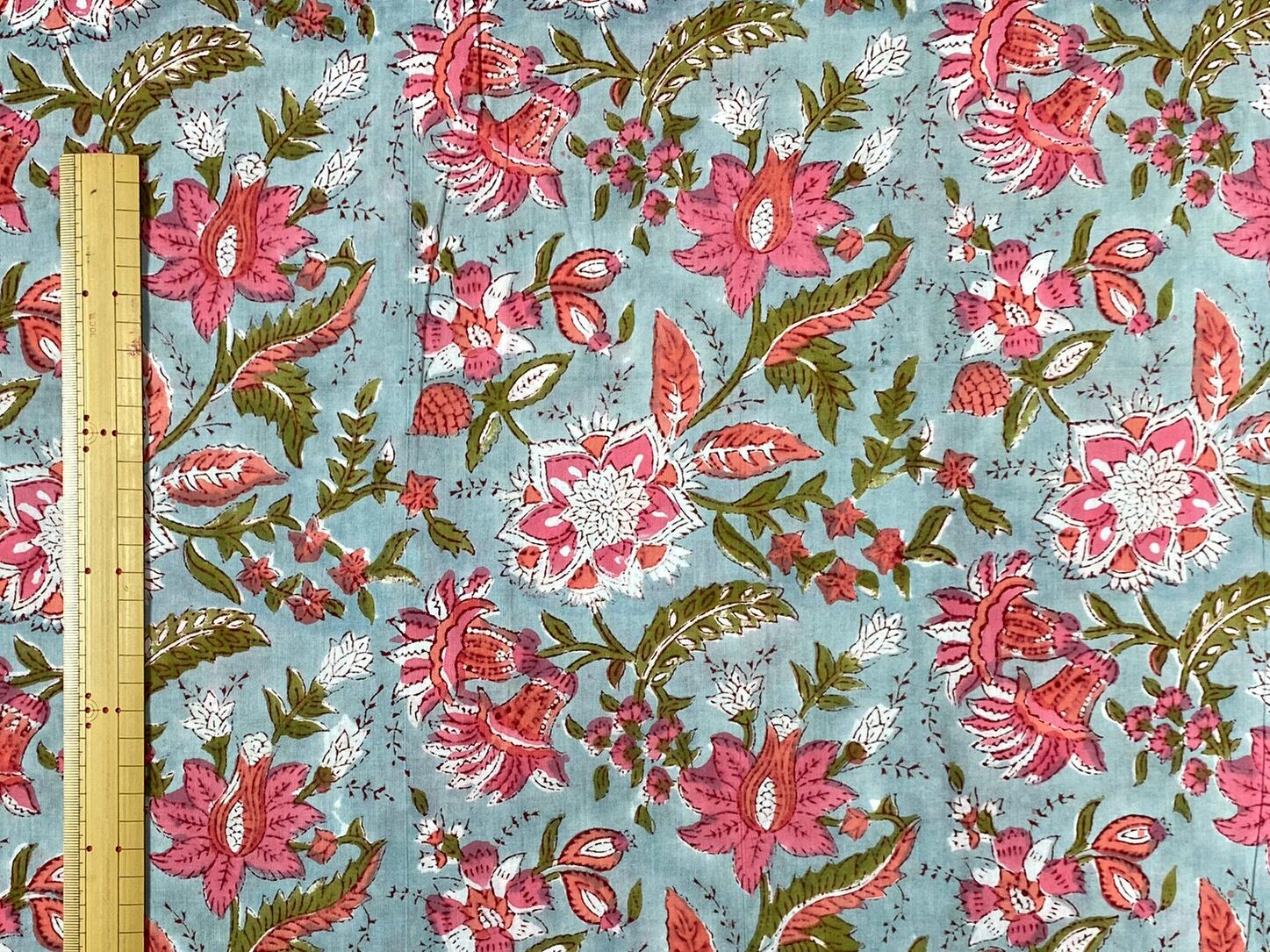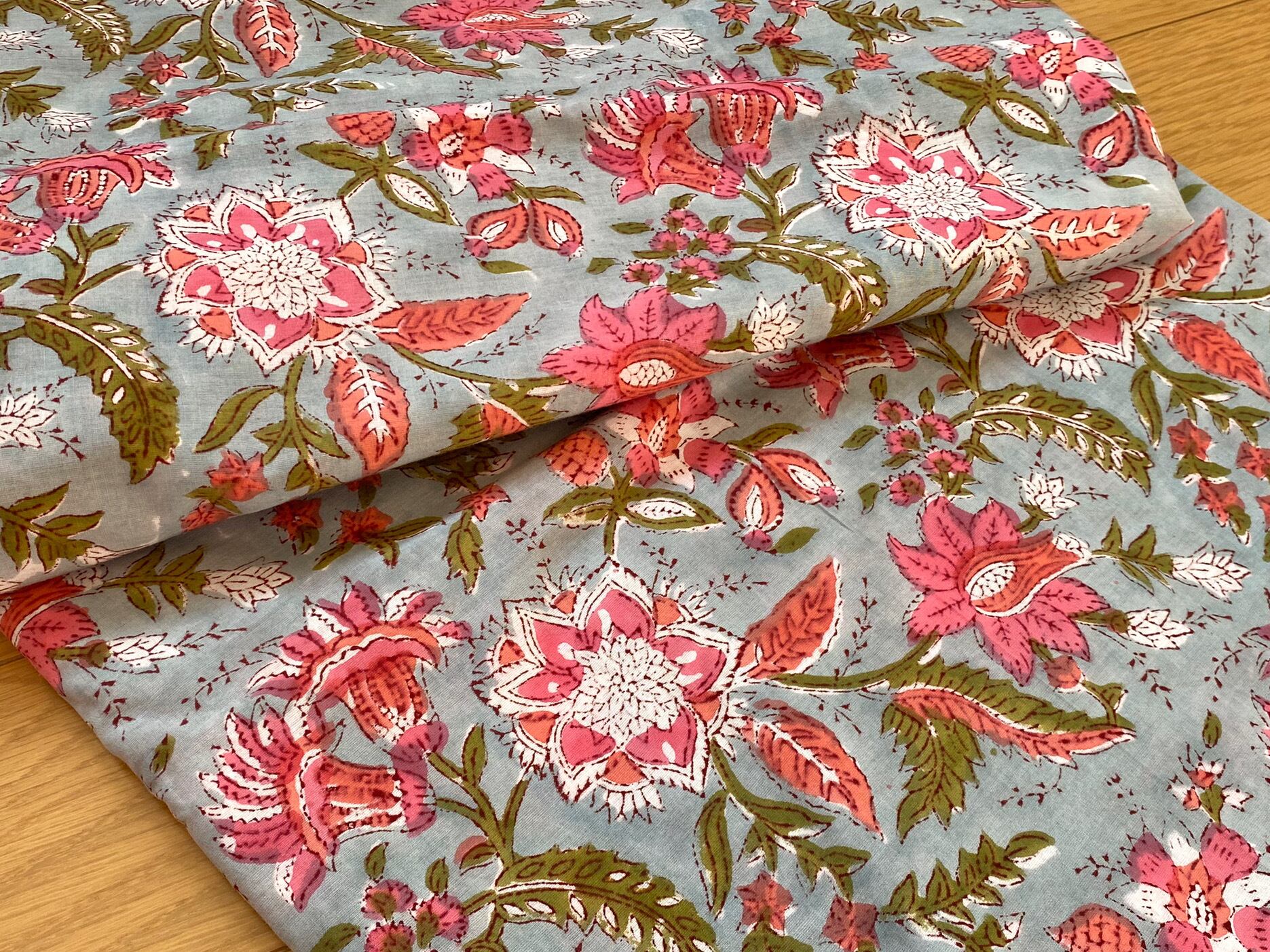 インド職人が木版を押し当て色柄を重ねて作っていくインドの伝統的な技法です。