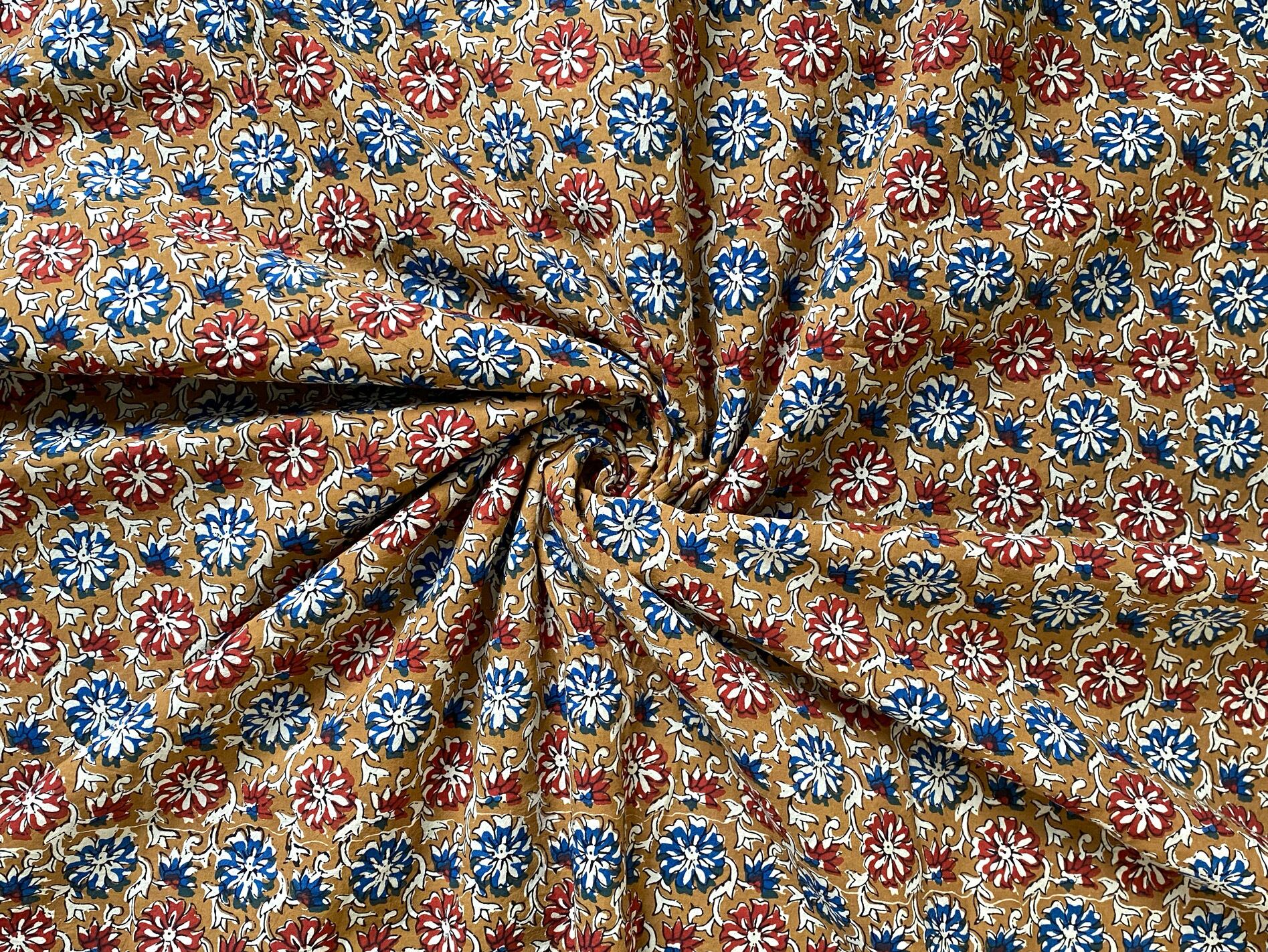 インド職人が木版を押し当て色柄を重ねて作っていくインドの伝統的な技法です。