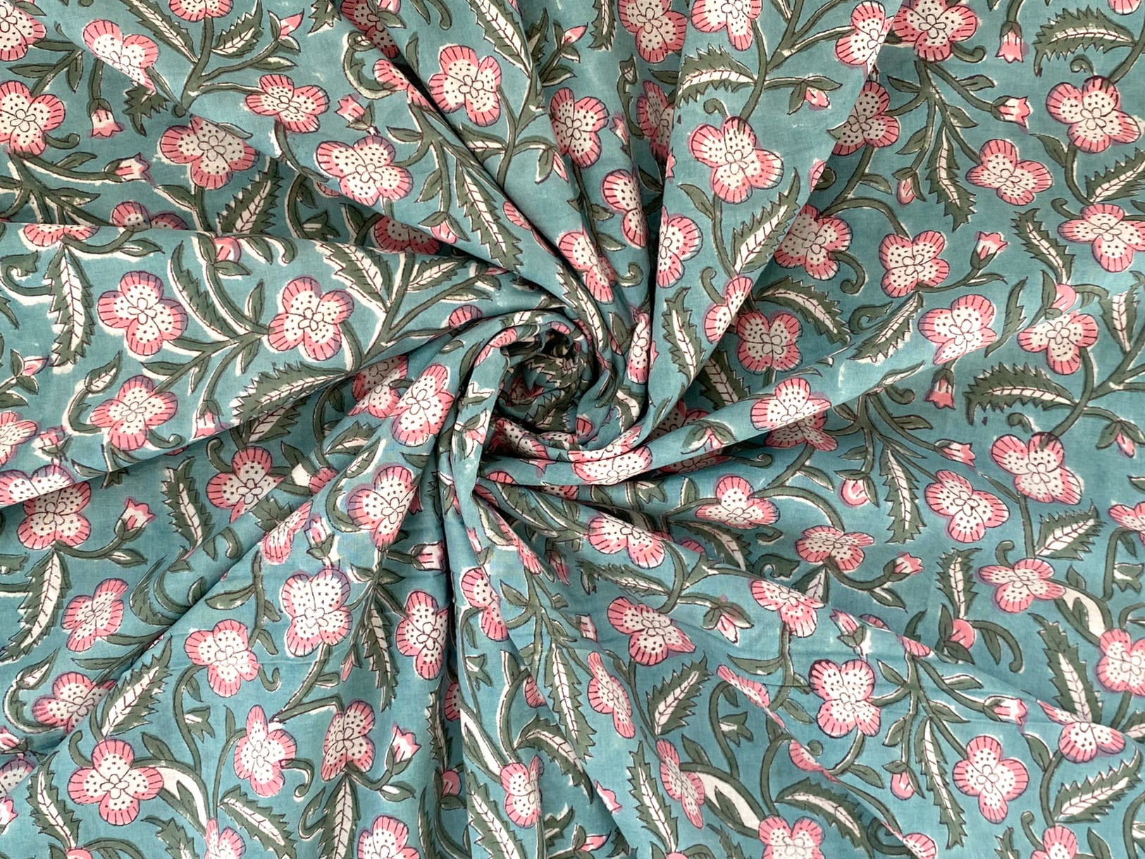 インド職人が木版を押し当て色柄を重ねて作っていくインドの伝統的な技法です。