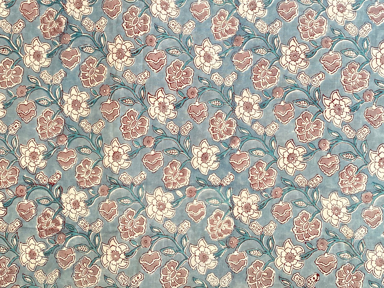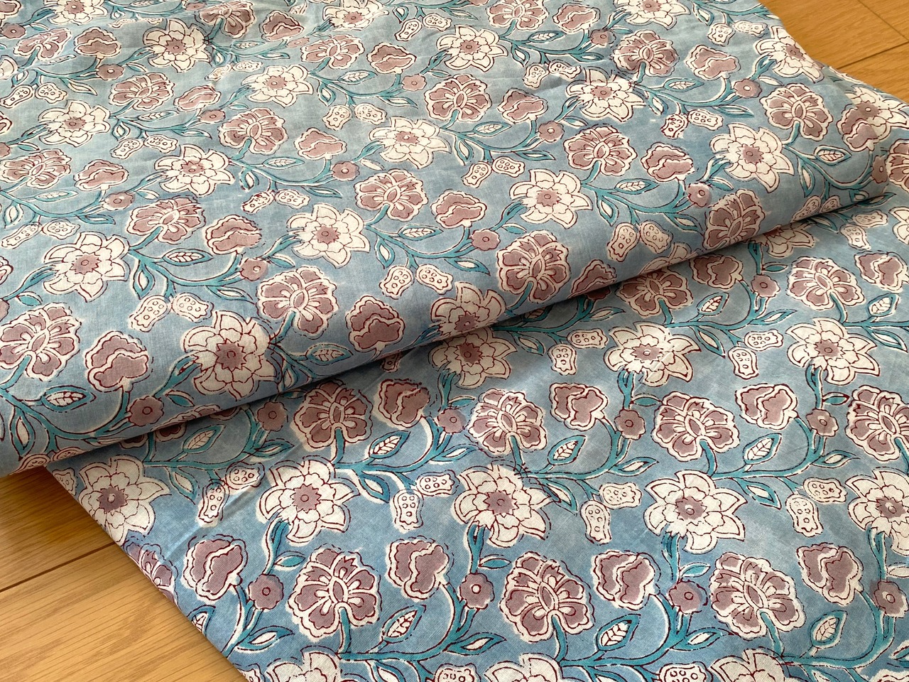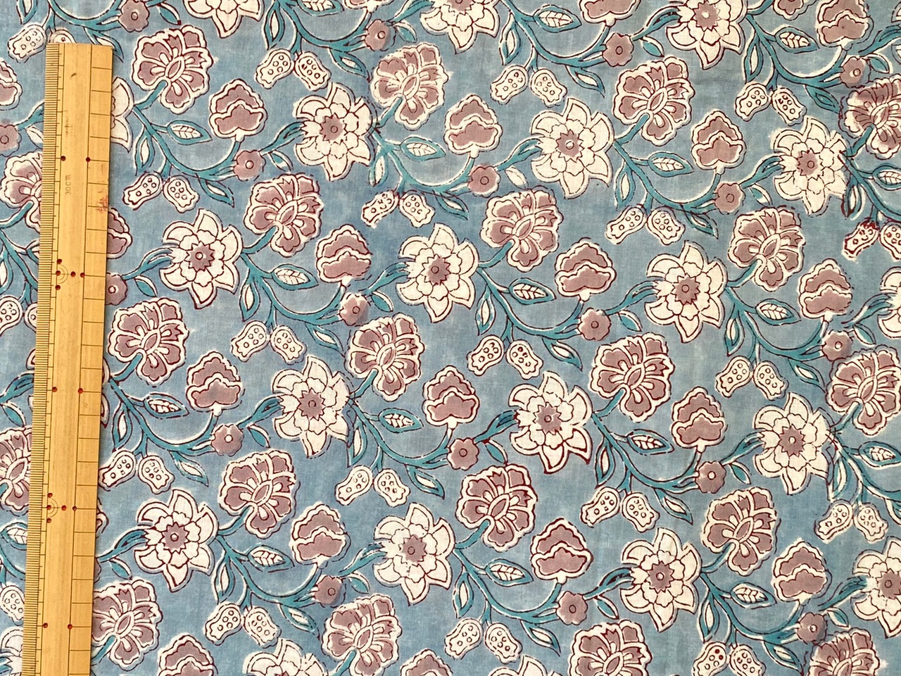 インド職人が木版を押し当て色柄を重ねて作っていくインドの伝統的な技法です。