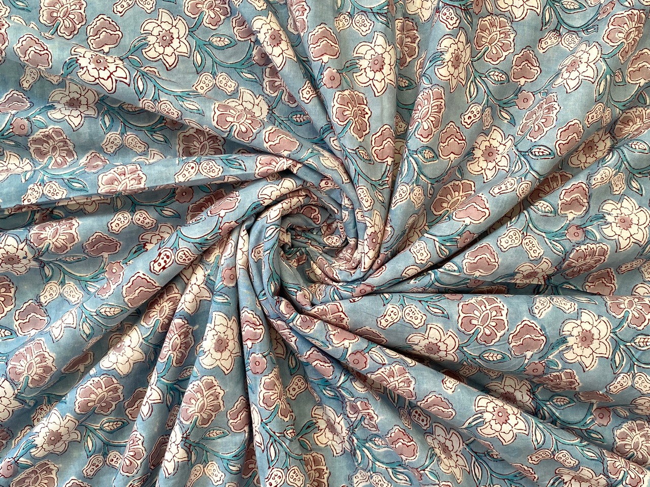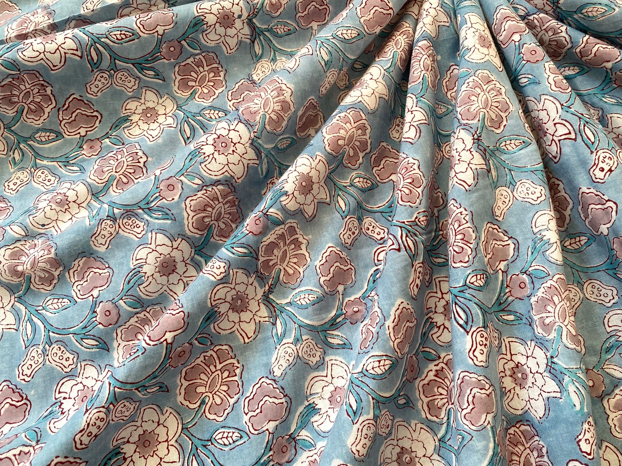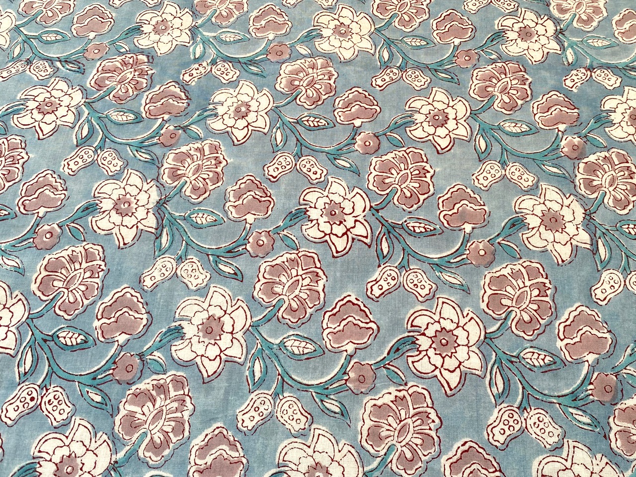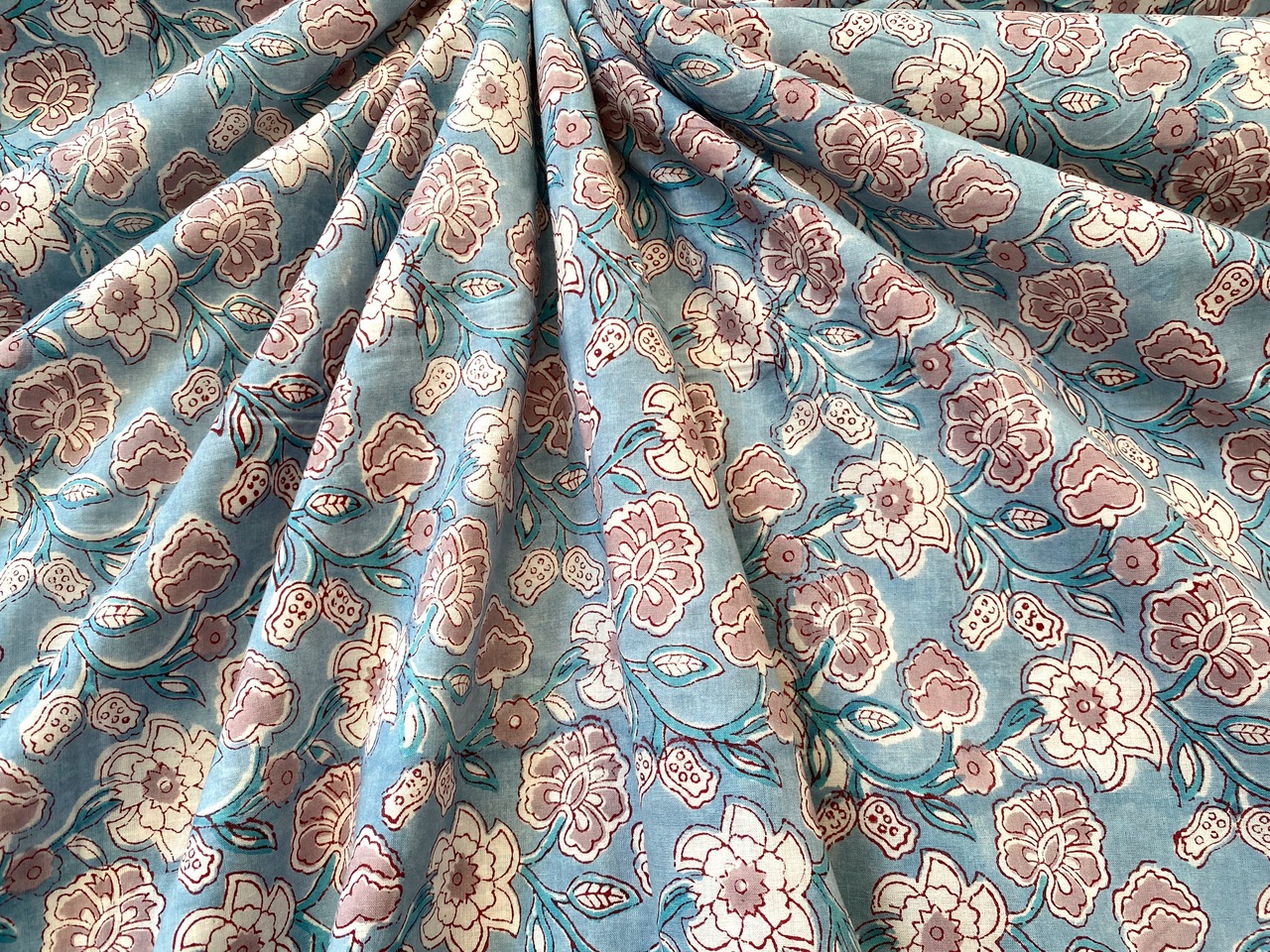 インド職人が木版を押し当て色柄を重ねて作っていくインドの伝統的な技法です。