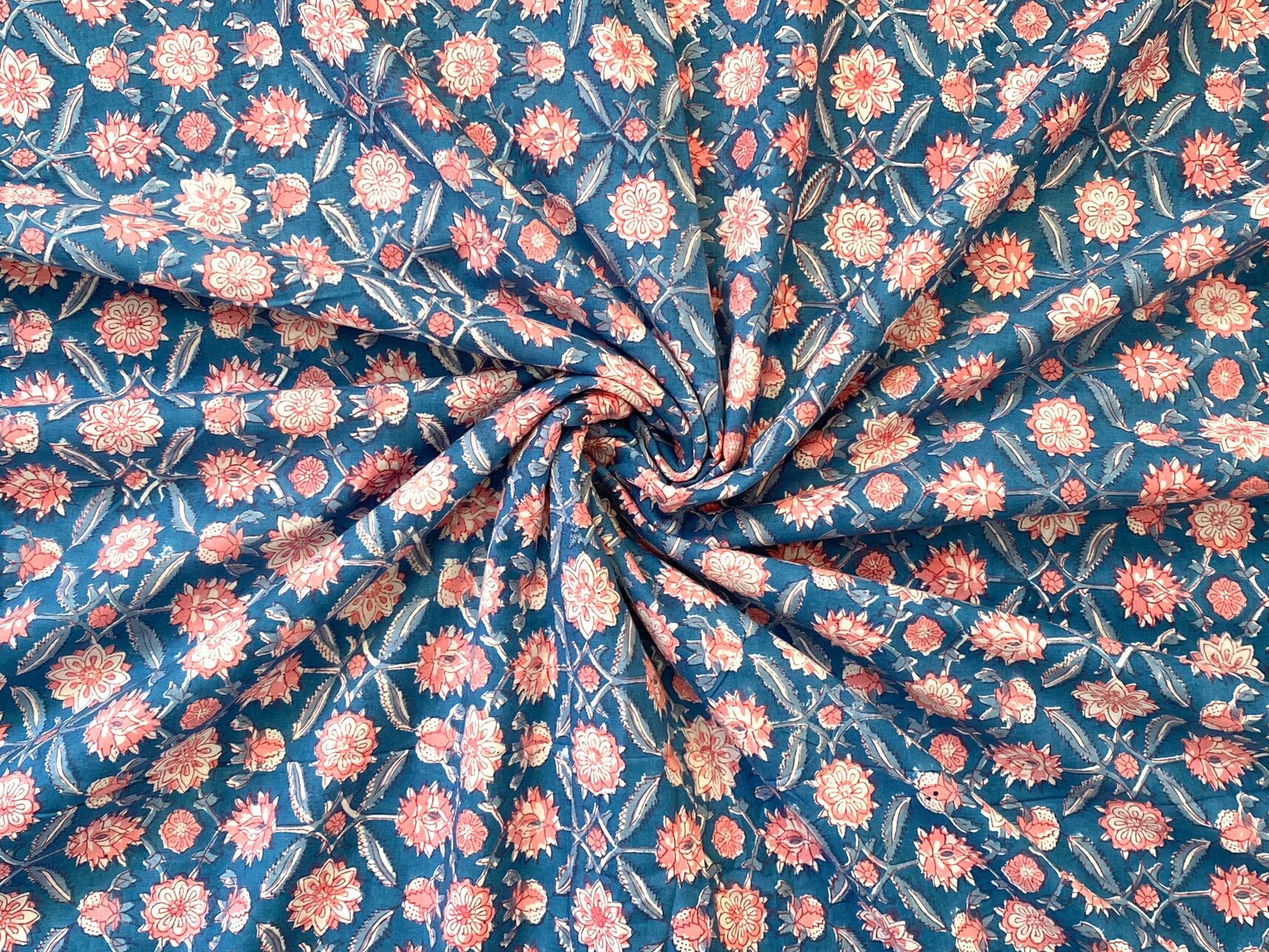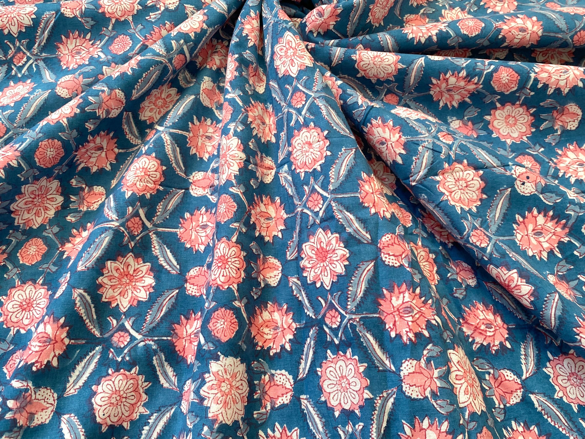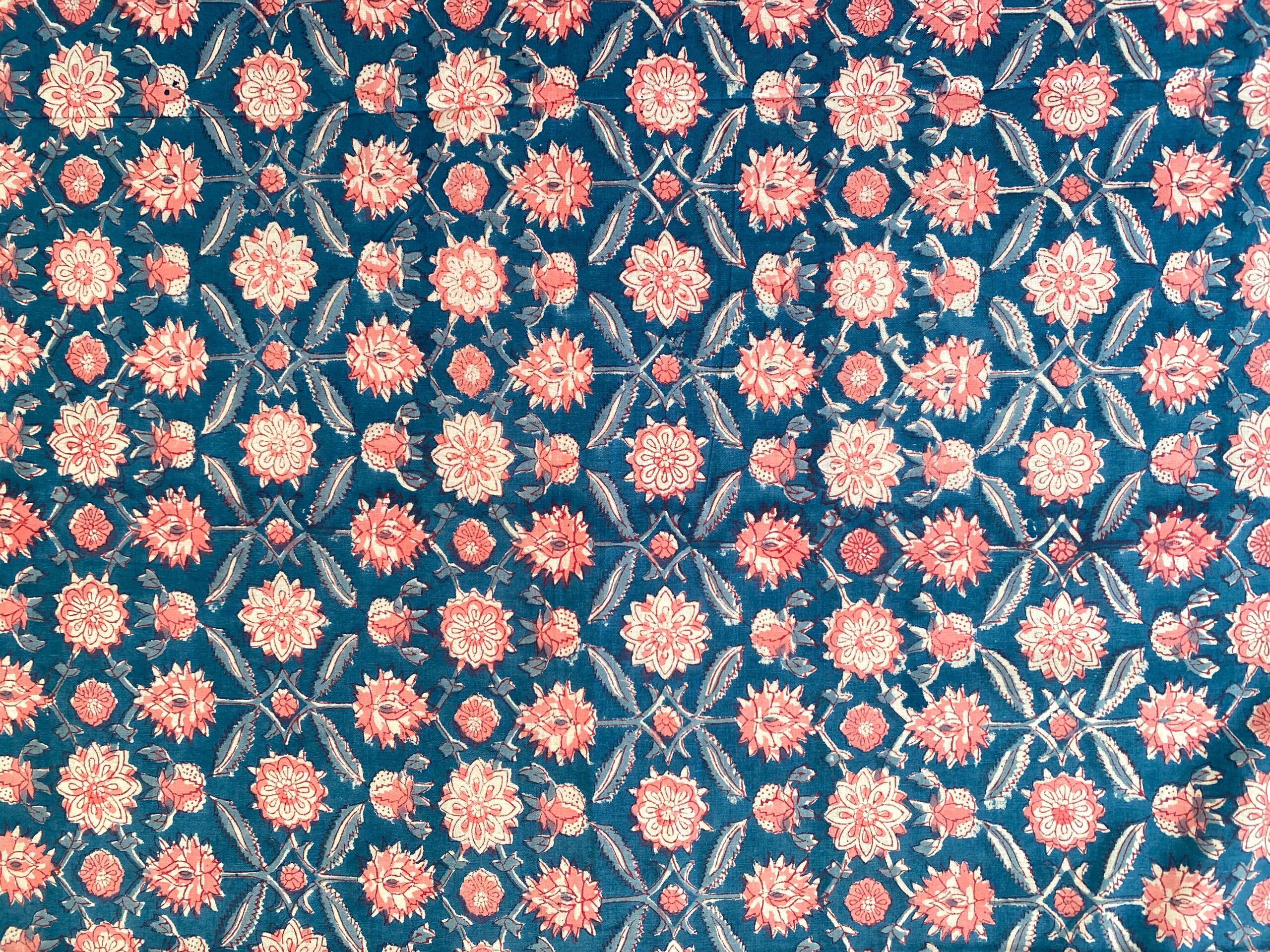 インド職人が木版を押し当て色柄を重ねて作っていくインドの伝統的な技法です。