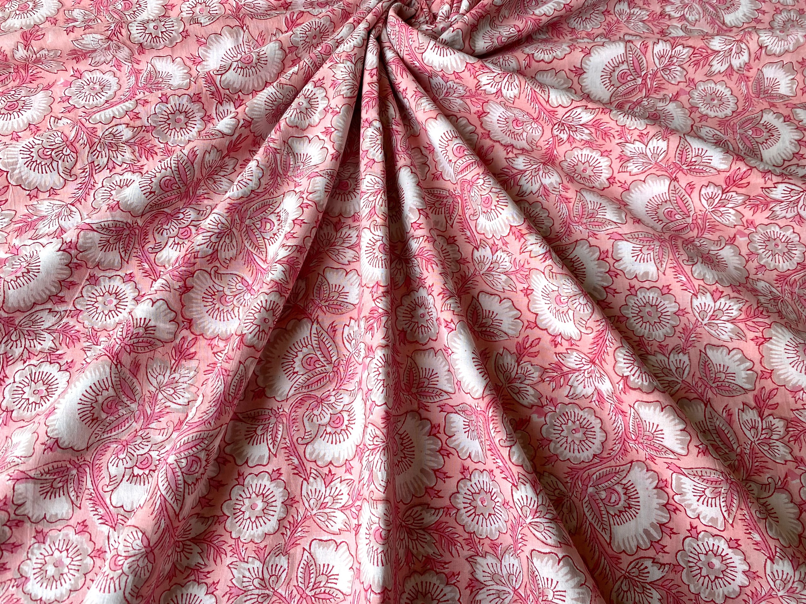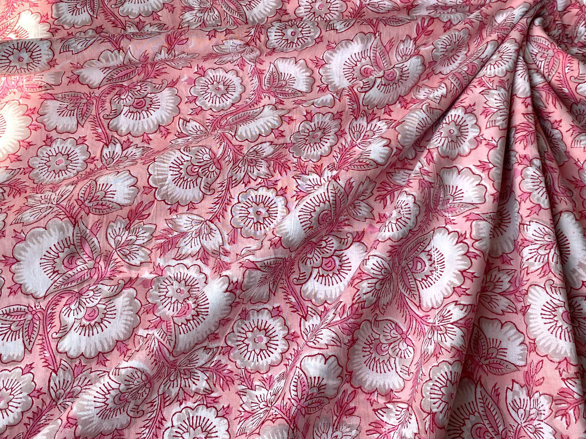 インド職人が木版を押し当て色柄を重ねて作っていくインドの伝統的な技法です。