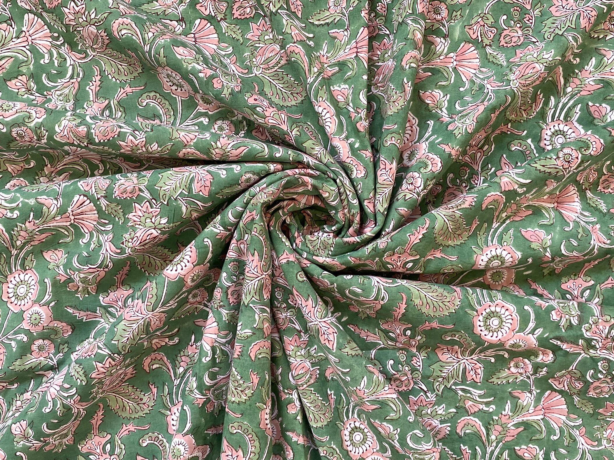 インド職人が木版を押し当て色柄を重ねて作っていくインドの伝統的な技法です。