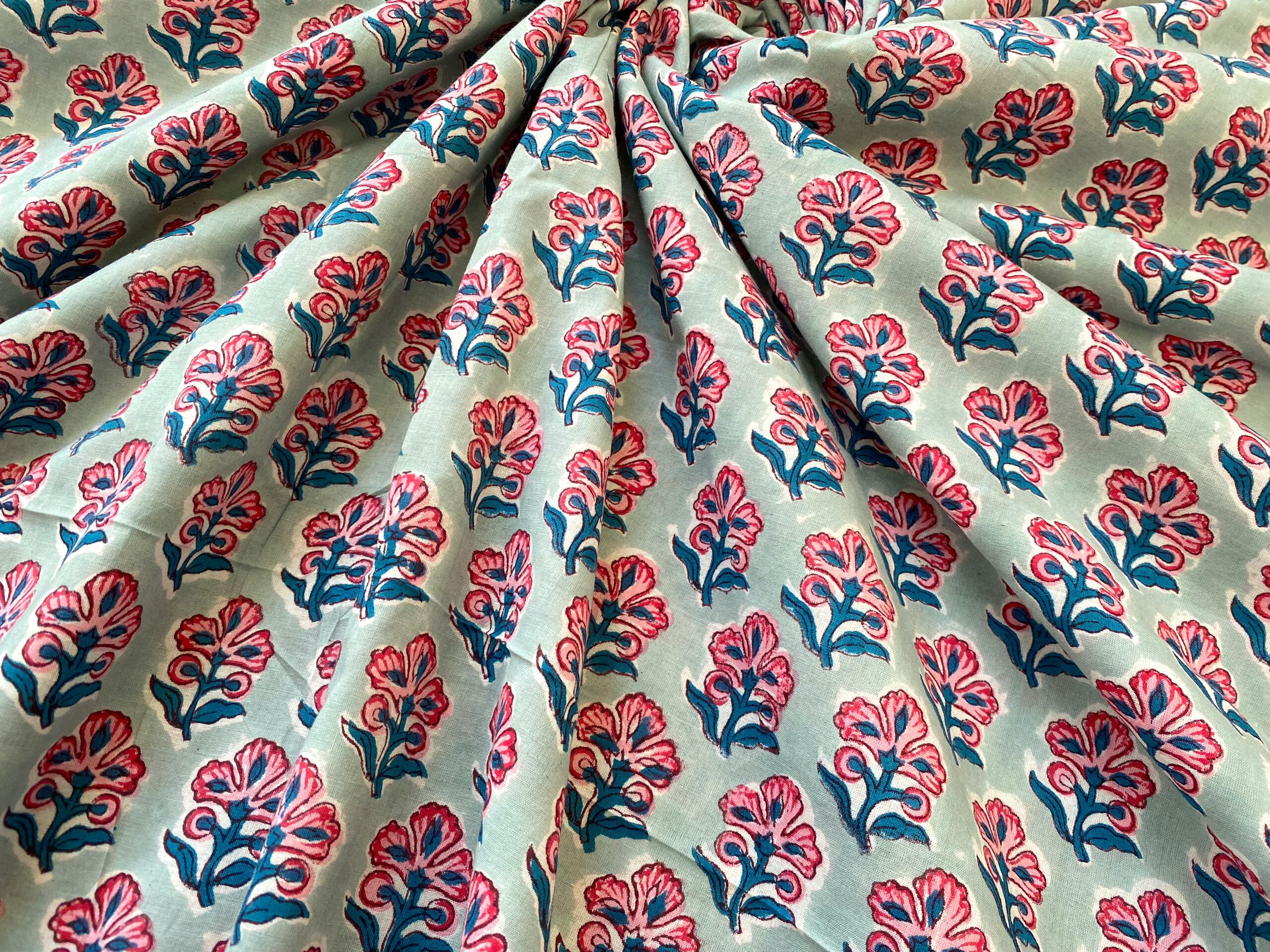 インド職人が木版を押し当て色柄を重ねて作っていくインドの伝統的な技法です。