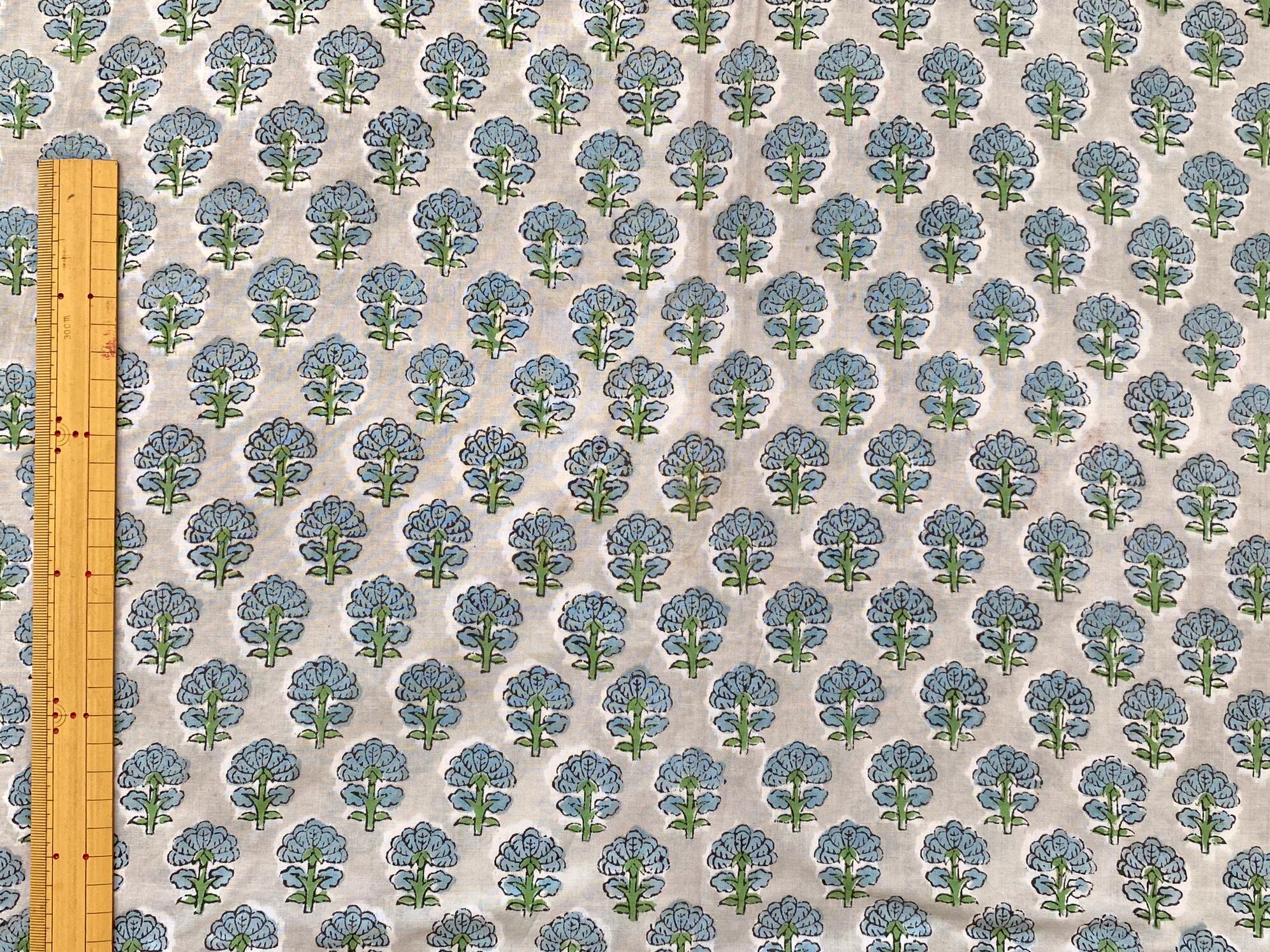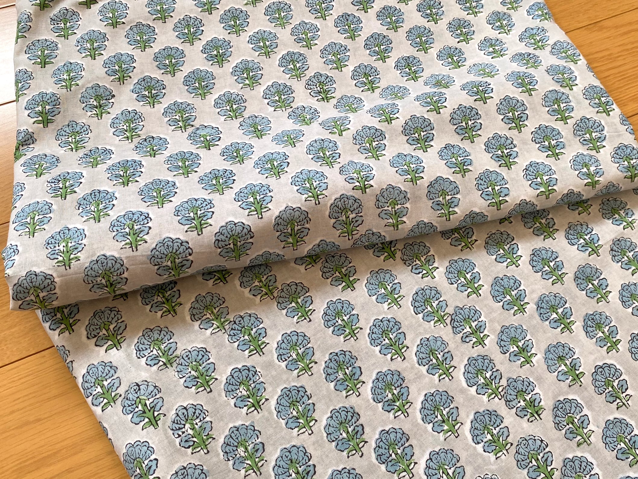インド職人が木版を押し当て色柄を重ねて作っていくインドの伝統的な技法です。