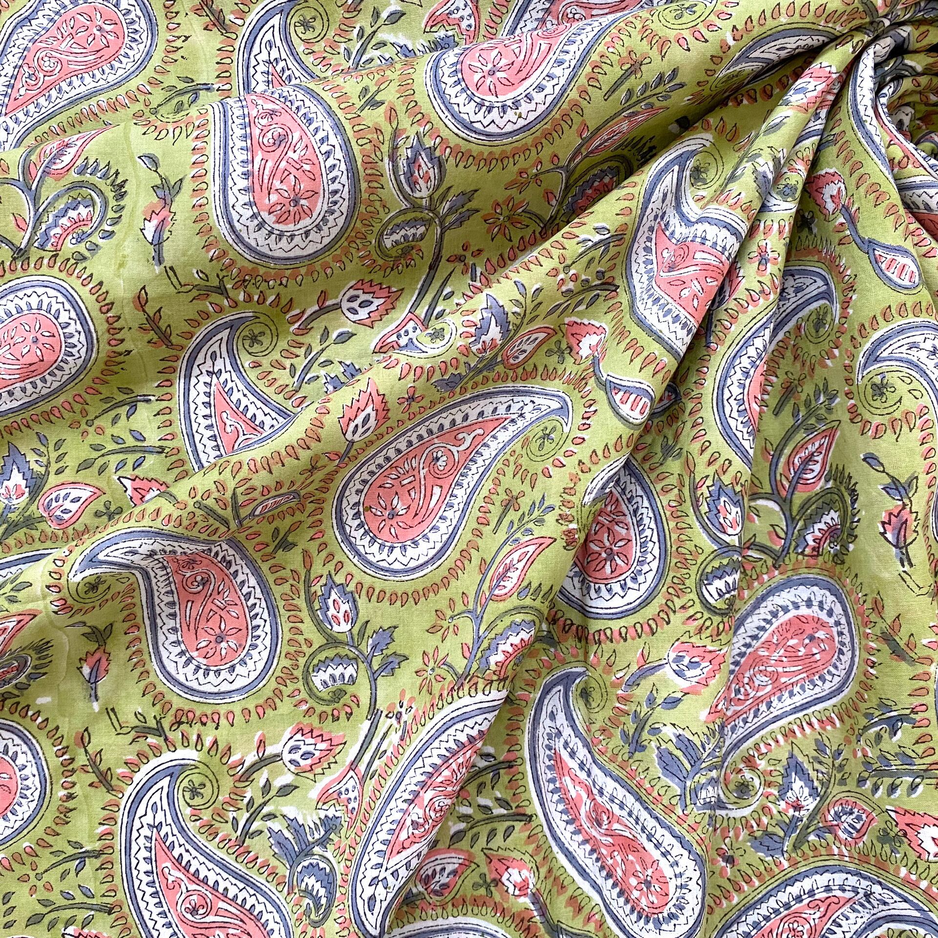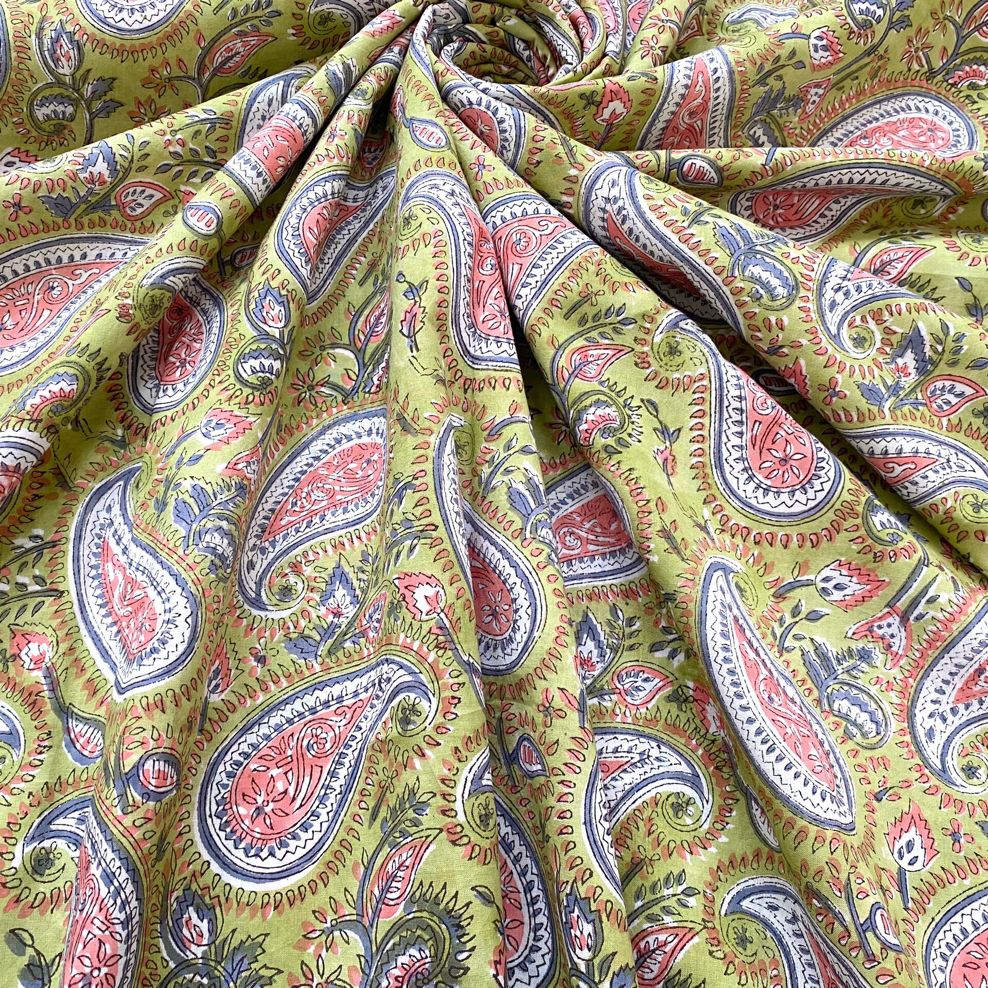 インド職人が木版を押し当て色柄を重ねて作っていくインドの伝統的な技法です。