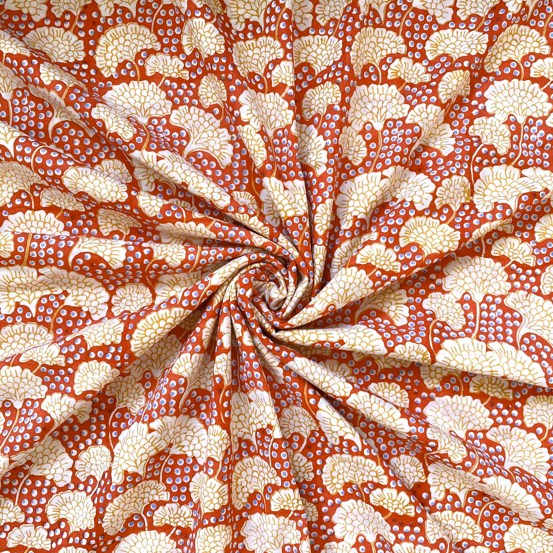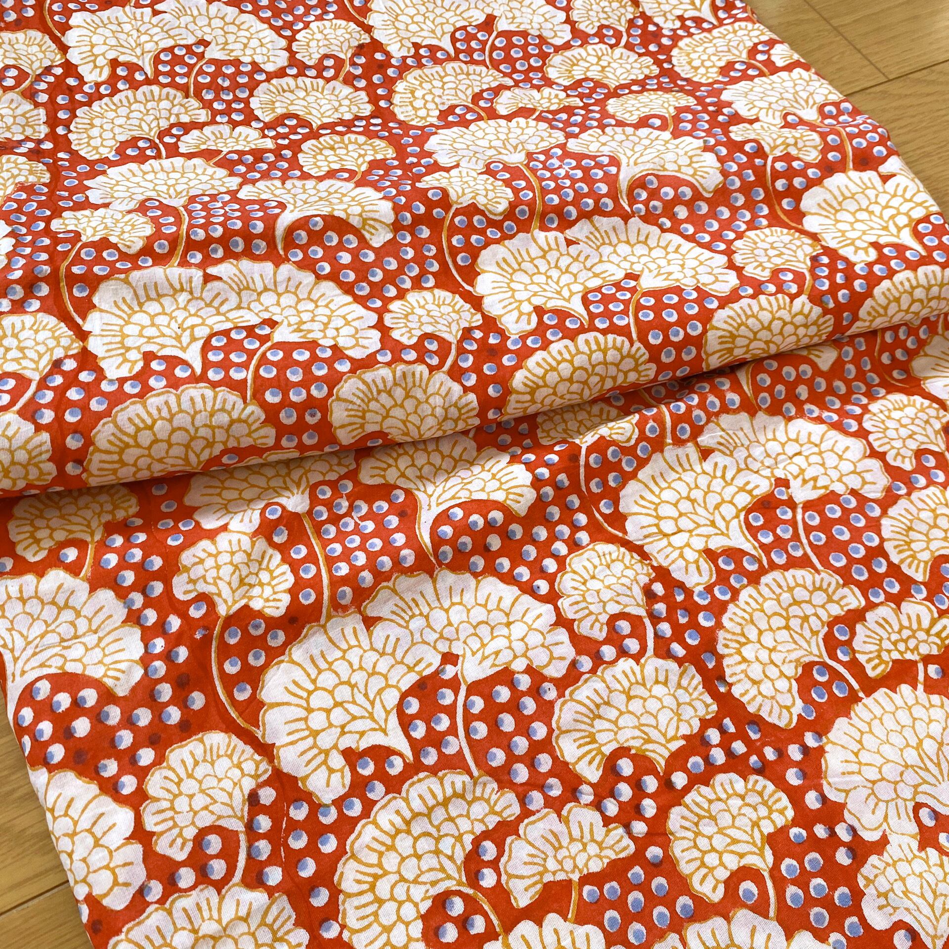 インド職人が木版を押し当て色柄を重ねて作っていくインドの伝統的な技法です。